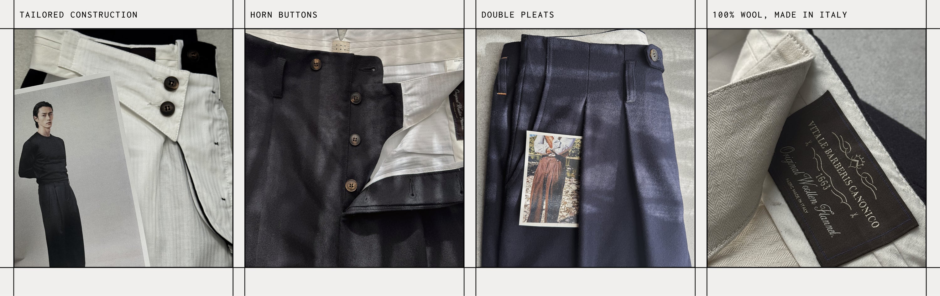The front features double pleats that enhance movement and volume, while lowered belt loops and a waistband-less construction create a continuous, uninterrupted line. A seven-button closure system and an internal tailored fastening ensure stability and a precise fit.
